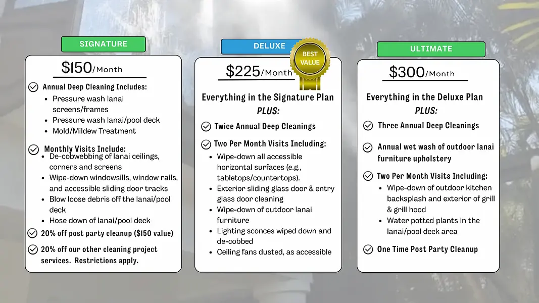 We clean screened enclosures, floors, outdoor furniture, and more—keeping your lanai beautiful and functional year-round.